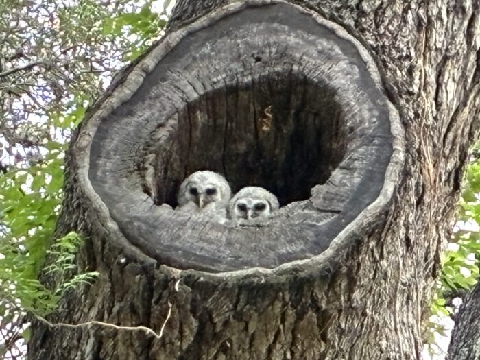Owlets. Baby barred owls, three of them and their very proud parents, in a tree hollow around the corner from our house.